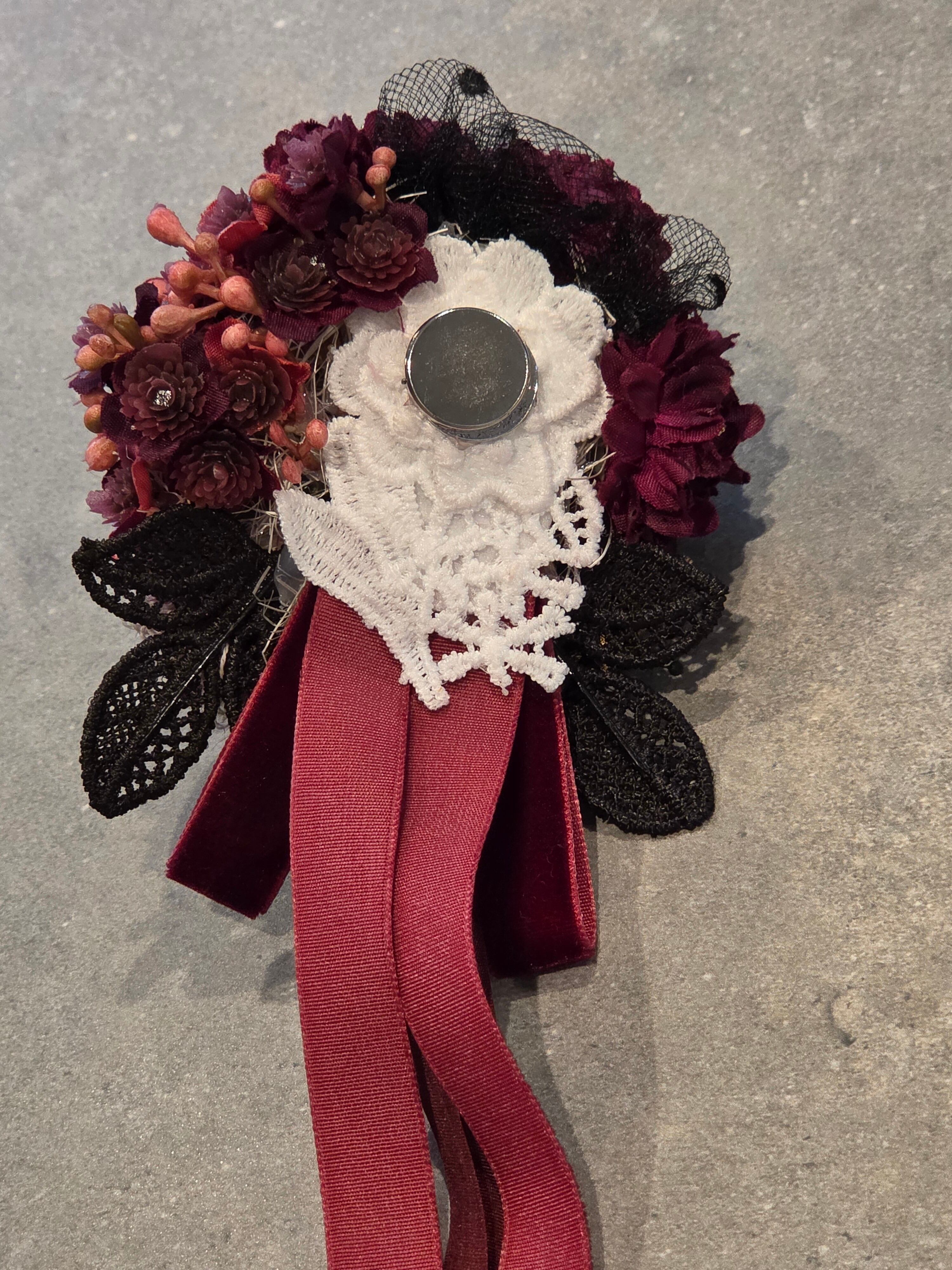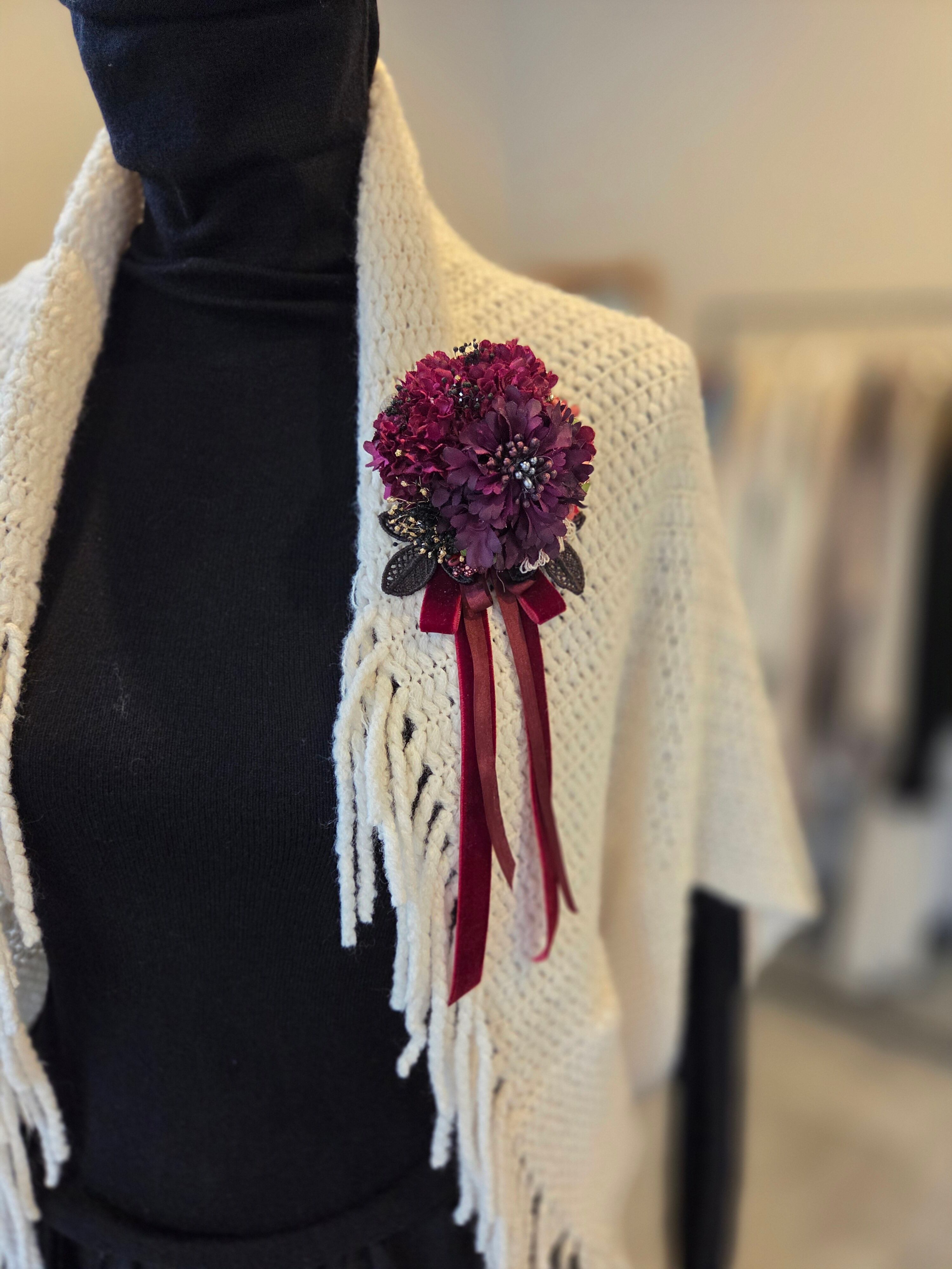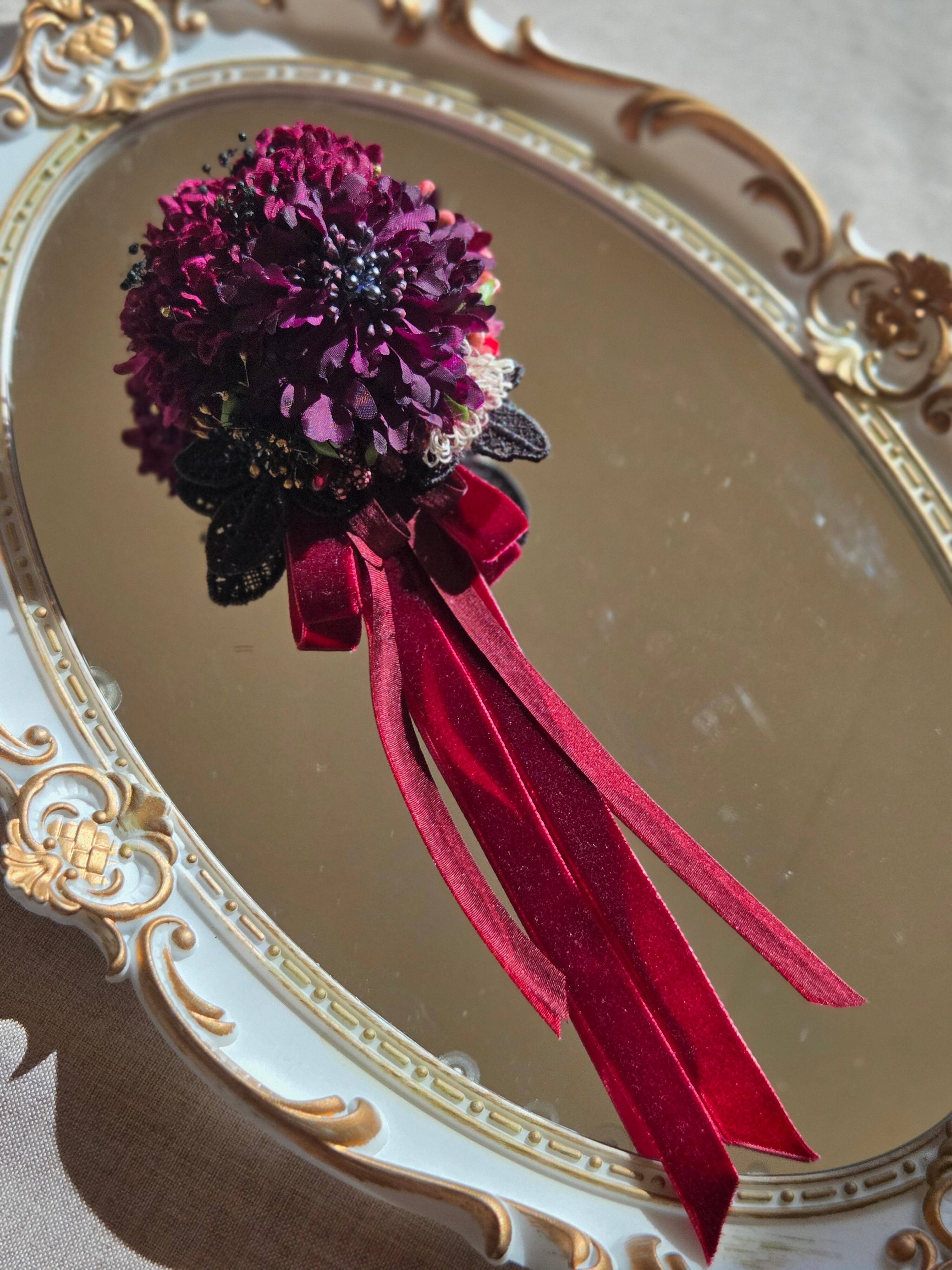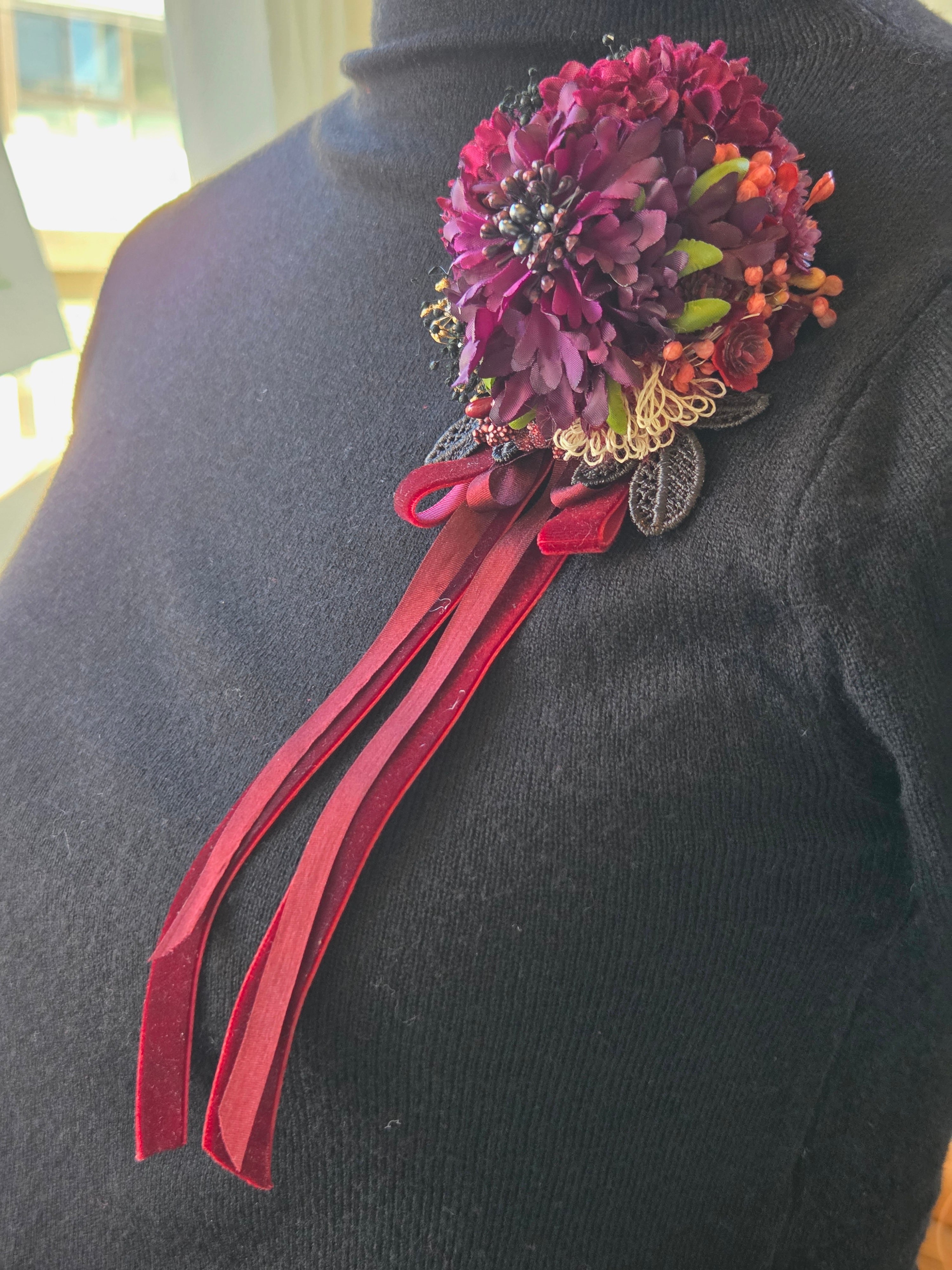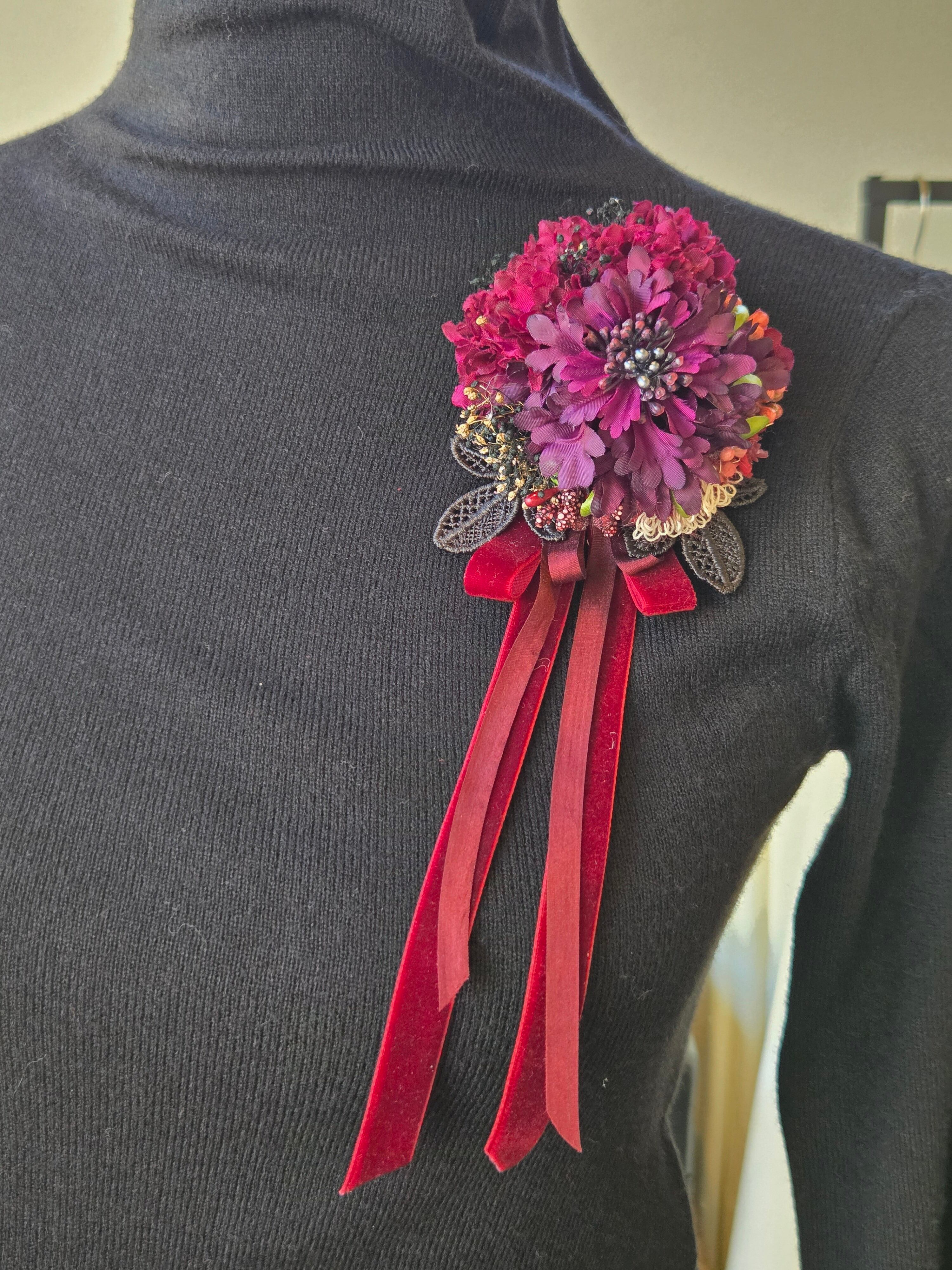 こちらの商品は、アーティフィシャルフラワー、プリザーブドフラワー、そしてベルベットやシルクのリボンで作られた華やかなコサージュです。マグネットで装着できるのでお洋服を痛めること無く特別な日のスタイルにも、普段使いにもピッタリです!さりげなくお洋服に花を添えて、あなたの魅力を一層引き立てます。