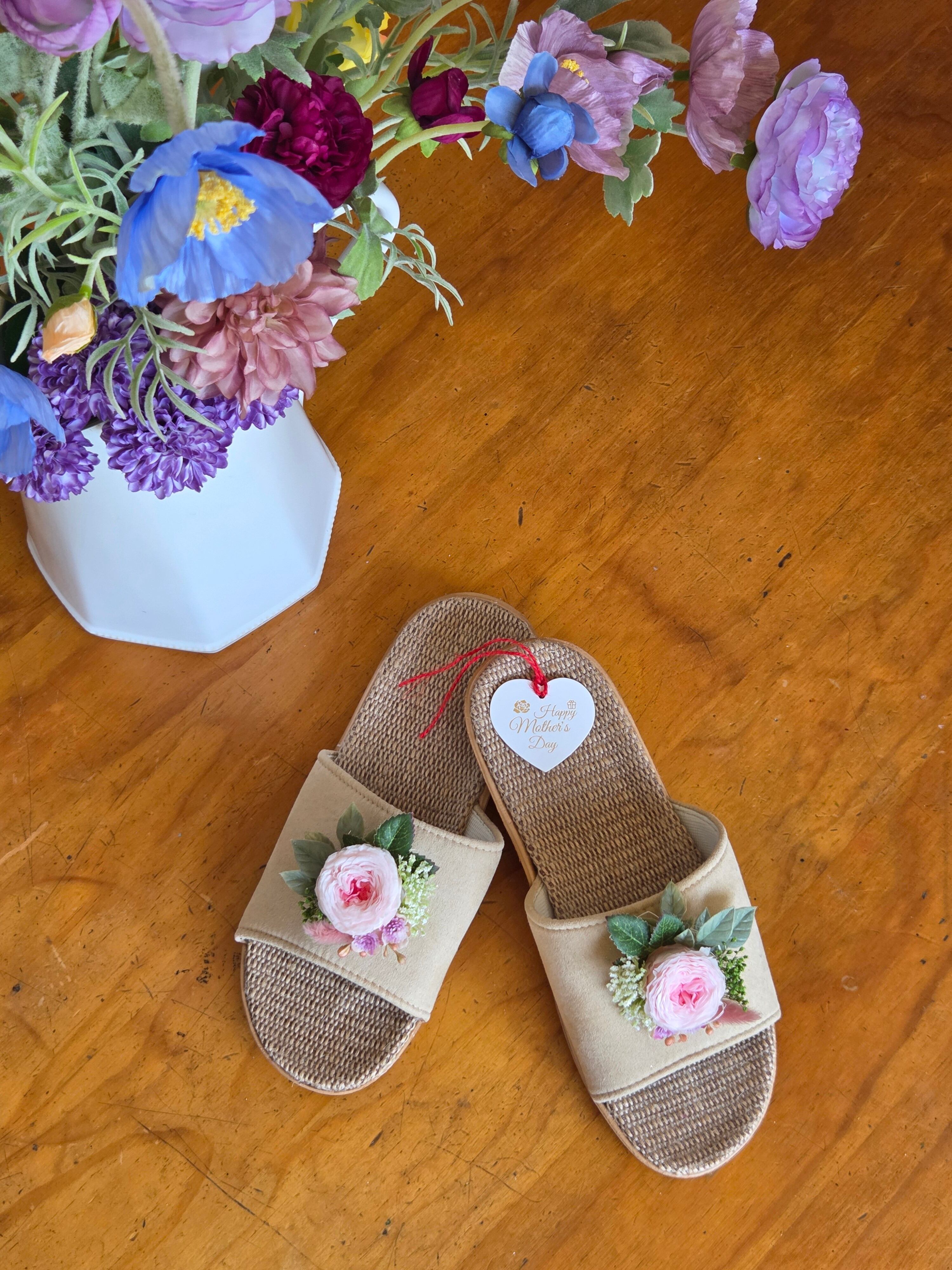 ナチュラルな麻素材のスリッパに、繊細なアーティフィシャルフラワーやプリザーブドフラワーを贅沢にあしらいました。