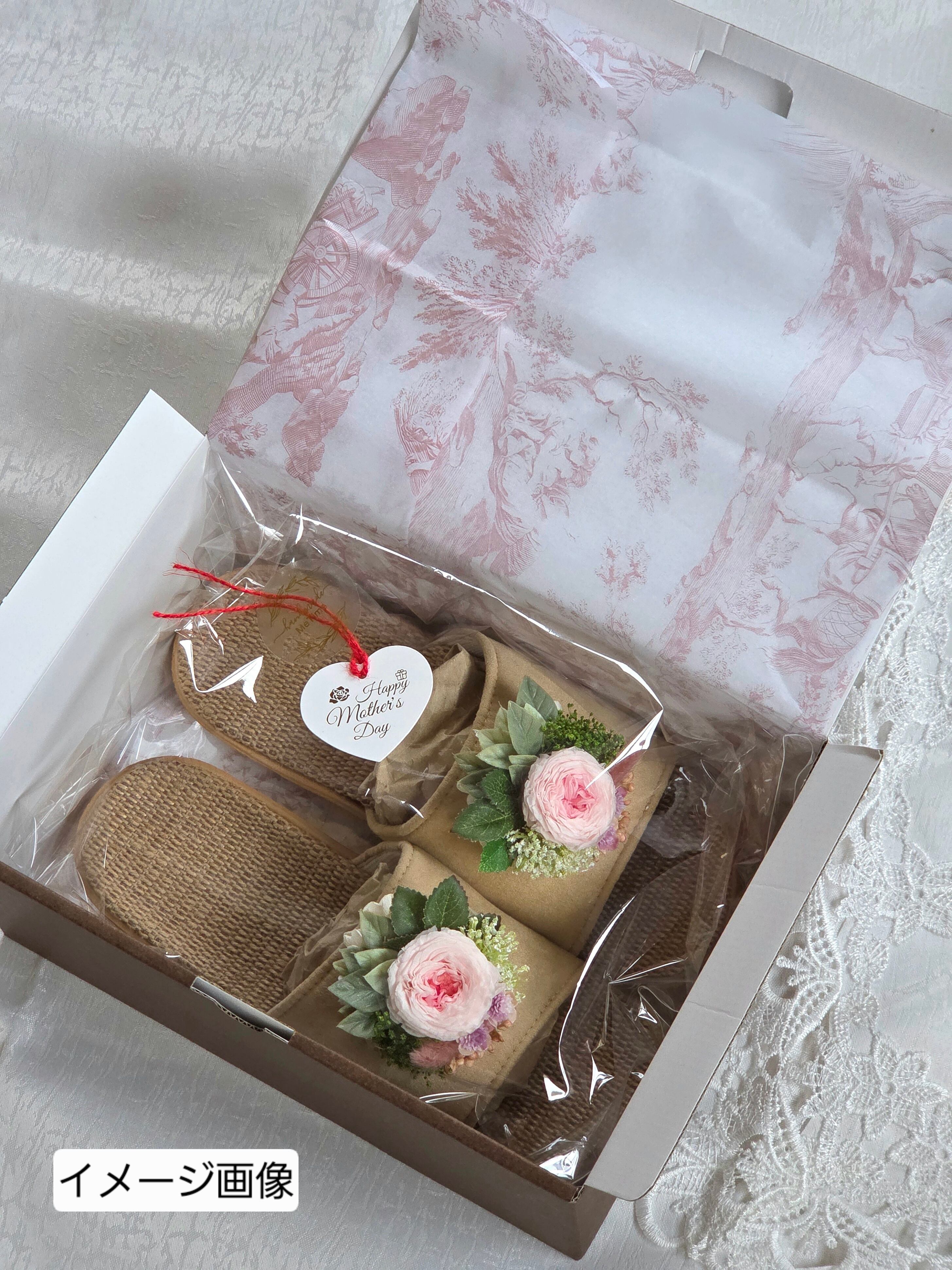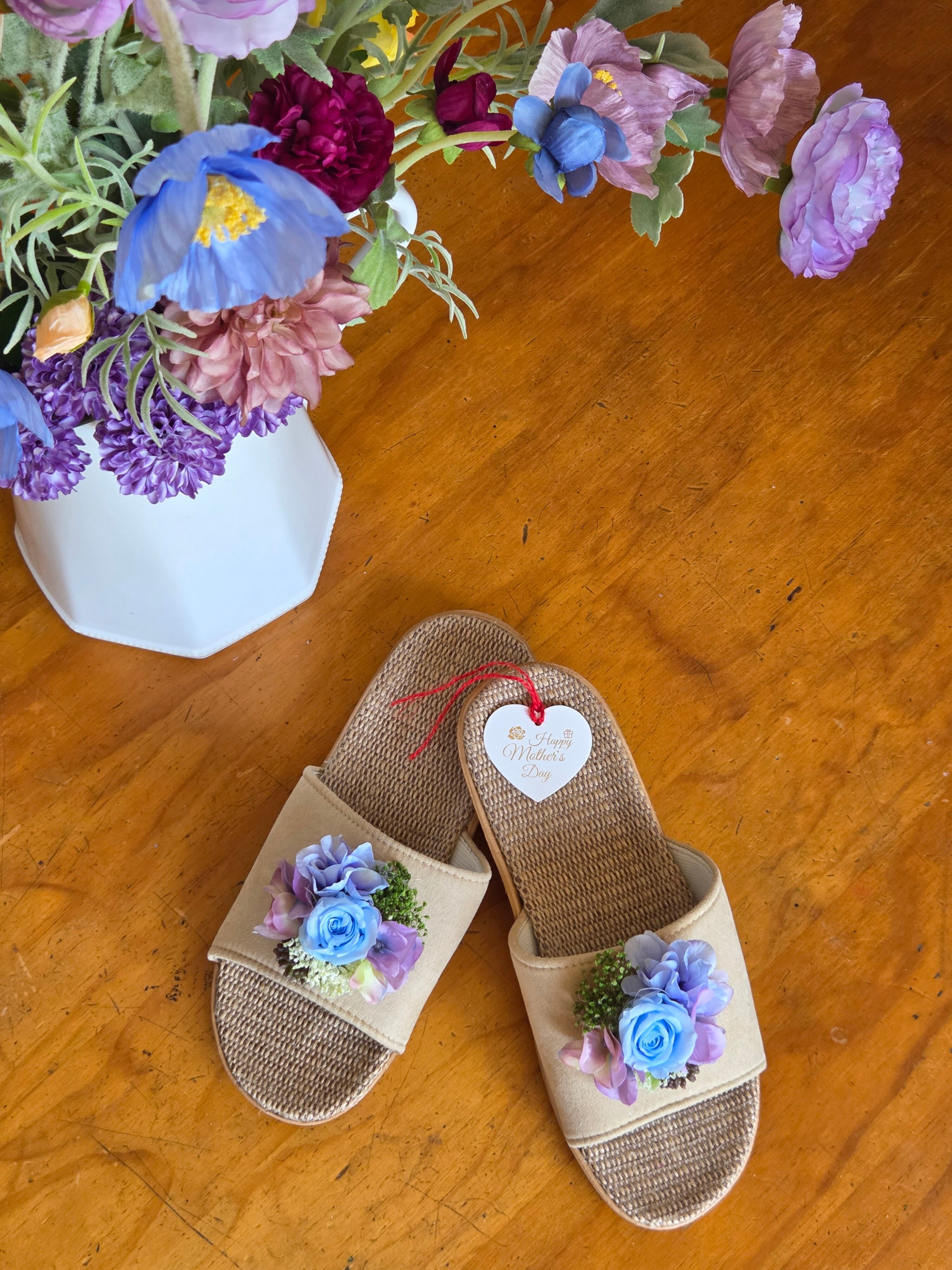 ナチュラルな麻素材のスリッパに、繊細なアーティフィシャルフラワーやプリザーブドフラワーを贅沢にあしらいました。